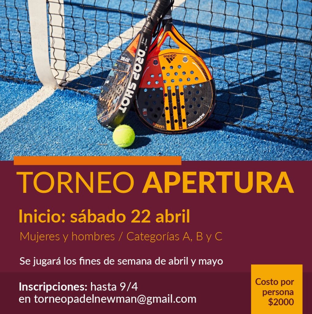 Los invitamos a participar del «Torneo Apertura» de pádel que se llevará a cabo el sábado 22 de abril, tanto para socias como para socios, en las categorías A, B y C.El torneo se jugará durante los fines de semana de abril y mayo y suma puntos para el ranking.Inscripciones: hasta el 9 de abril a través del mail torneopadelnewman@gmail.comEl costo por persona es de $2000 y el cupo es limitado. ¡Los esperamos!